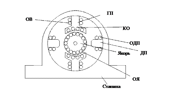 На главных полюсах расположена обмотка возбуждения (ОВ).