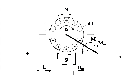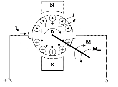 При подаче напряжения на обмотку якоря в ней возникает электрический ток. В результате взаимодействия тока обмотки якоря и магнитного поля, создаваемого обмоткой возбуждения, возникает вращающий момент. В результате движения проводников обмотки якоря в магнитном поле в них индуцируется ЭДС, направленная встречно напряжению сети.