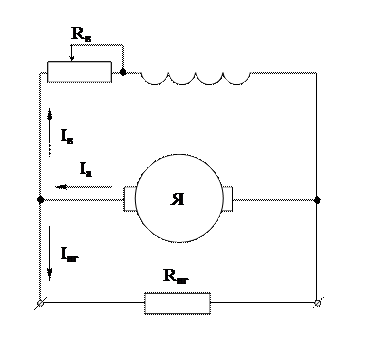 Обмотка возбуждения подключается параллельно обмотке якоря. В машине используется принцип самовозбуждения при котором обмотка возбуждения получает питание от обмотки якоря.