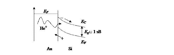 Под номером 1 – ускоритель ионов, роль которого выполняет либо электростатический генератор, либо в случае высокой энергии циклотрон. Энергия ионов велика и лежит в диапазоне 0,5 – 6 МэВ. Для большинства опытов достаточно 2 – 2,5 МэВ. Пучок ионов 2 попадает на поверхность образца 3, рассеивается под углом θ и регистрируется барьерным детектором 4. К диодной структуре барьерного детектора (золото – кремний) приложено внешнее напряжение, что приводит к искривлению зон в кремнии и создает условия для разделения электронно-дырочных пар, образующихся в кремнии при поглощении ионов.