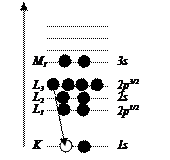 Переход электрона с верхних оболочек сопровождается излучением кванта электромагнитного излучения, энергия которого равна разности энергий двух участвующих в переходе состояний. Вследствие этого, генерируемое излучение относится к рентгеновскому диапазону. Число линий, соответствующих переходам с верхних состояний на нижние ограничено правилом отбора