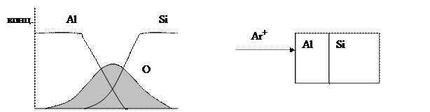 Пример: алюминий напылен на кремний. Исследуем профиль распределения различных элементов по глубине. Т.е. поверхность травится ионным пучком, дно кратера облучается электронами и измеряется концентрация элементов.