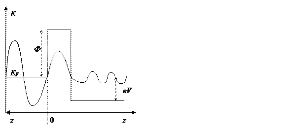 Рассмотрим особенности хода волновой функции электронов в двух образцах, которые находятся на малом расстоянии друг от друга. Поверхность металлического образца может быть описана ступенчатым поверхностным барьером. Высота барьера будет равняться работе выхода электрона.