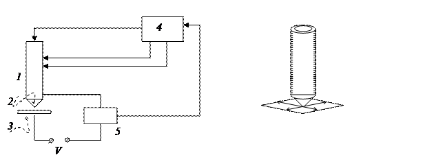 Строение микроскопа: 1 – пьезопривод, позволяюший перемещать острие зонда 2 с ангстремной точностью. Пьезопривод представляет собой керамический цилиндр, на поверхность которого напылены электроды. Приложение напряжения к этим электродам при помощи управляющего устройства 4 обеспечивает высоковоспроизводимые деформации пьезокерамики как вдоль координат x, y, так и вдоль координаты z. Величина перемещения вдоль z такова, что обеспечивает поддержание туннельного тока
