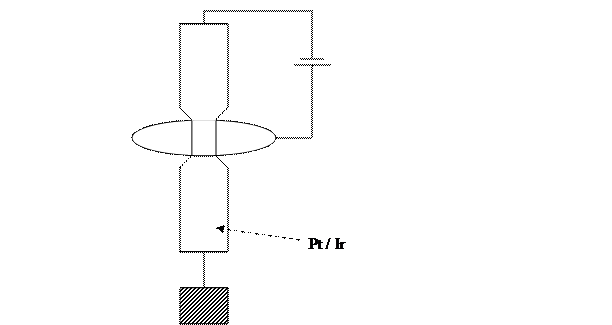Если потенциальный барьер достаточно тонкий, т.е. второй образец может быть подведен к первому на очень малое расстояние, то появляется возможность проникновения электрона во второй образец. Это эквивалентно вероятности переноса электрона, или другими словами, его туннелирования через потенциальный барьер. Движущей силой для такого переноса и регистрации туннельного тока во внешней цепи будет являться небольшое электрическое смещение, т.е. потенциал