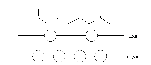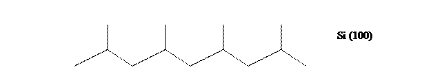 Предположим, указанная структура получена путем скола в вакууме. Она быстро димеризуется, что приводит к снижению поверхности. Если приложить к зонду напряжение в -1,6 В, то изображение будет иметь такое вид, и в нем будут видны связи между димерами, имеющие заполненные орбитали. Если выбрать напряжение в +1,6 В[2], то картинка изменится. Теперь она будет отображать области локализации акцепторных состояний, соответствующих неспаренным оборванным связям.