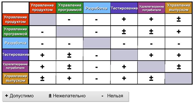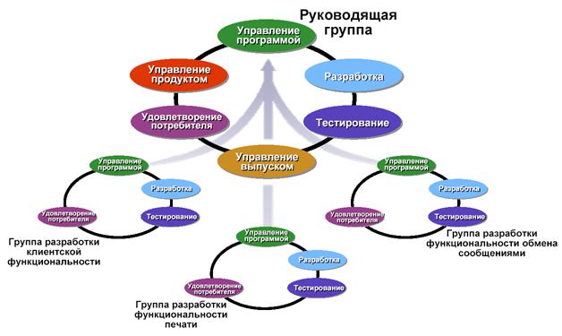 Модель проектной группы MSF предлагает разбиение больших команд (более 10 человек) на малые многопрофильные группы направлений. Эти малые коллективы работают параллельно, регулярно синхронизируя свои усилия. Группы направлений - это компактные мини-команды, в которые входят по одному или несколько членов из разных ролевых кластеров. Такие команды имеют четко определенную задачу и ответственны за все относящиеся к ней вопросы, начиная от проектирования и составления календарного графика.