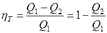 Конденсация пара происходит путем отвода тепла Q2 с циркуляционной водой, в большом количестве пропускаемой через конденсатор. Разность теплоты, полученной от горячего источника Q1, и переданной холодному источнику Q2 определяет полезную работу цикла. Отношение количества теплоты, превращенной в работу, к подведенной теплоте называют термическим КПД цикла ηт