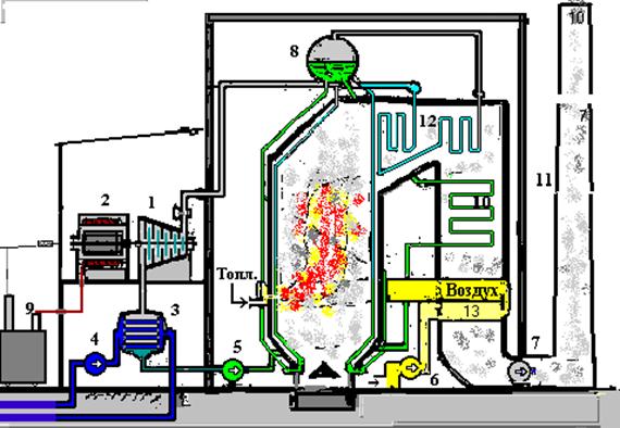 В центре схемы размещается котел, в который подается топливо вместе с нагретым в воздухоподогревателе (13) воздухом, нагнетаемым дутьевым вентилятором (6). Острый пар после пароперегревателя (12) по главному паропроводу поступает в паровую турбину (1). Образовавшийся в конденсаторе (3) конденсат питательным насосом (5) через водяной экономайзер (10) подается в барабан (8) котла, Откуда по трубам опускается в коллектор холодной воды и затем поступает в экранные трубки котла. Продукты сгорания дымососом (7) выбрасываются в трубу (11).