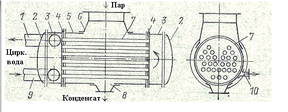1 – патрубок для выхода воды; 2 – крышка водяных камер; 3 – водяные камеры; 4 – трубные решетки; 5 – корпус конденсатора; 6 – пароприемная горловина; 7 –трубки; 8 – сборник конденсата; 9 –патрубок подвода воды; 10 – патрубок для удаления воздуха.