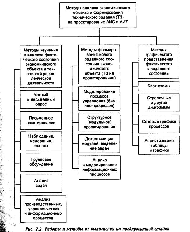 На предпроектнй стадии проводится изучение и анализ всех особенностей объекта проектирования с целью уточнения требований заказчика, их формализованного представления и документирования. В частности, выявляется совокупность условий, при которых предполагается эксплуатировать будущую систему (аппаратные и программные ресурсы, предоставляемые системе; внешние условия ее функционирования; состав людей и работ, имеющих к ней отношение и участвующих в информационных и управленческих процессах), производится описание выполняемых системой функций и т.п. На этой же стадии устанавливаются ограничения в процессе разработки (директивные сроки завершения отдельных этапов, имеющиеся ресурсы, организационные процедуры и мероприятия, обеспечивающие защиту информации и т.п.).