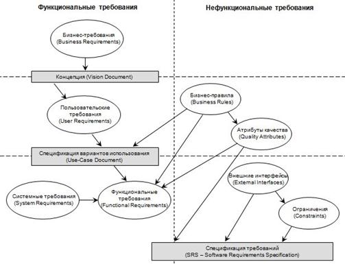 Требования к ПО состоят из трех уровней – бизнес-требования, требования пользователей и функциональные требования. Вдобавок каждая система имеет свои нефункциональные требования. Модель на рис. 2.1. иллюстрирует способ представления этих типов требований. Овалы обозначают типы информации для требований, а прямоугольники – способ хранения информации (документы, диаграммы).