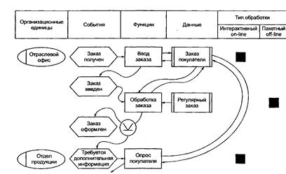 В системе R/3 для отображения процессов используется модель управления событиями (ЕРС – event-driven process chain), реализованная в ARIS Toolset (рис. 2.3). В соответствии с этим методом переходы между операциями осуществляются в зависимости от событий, которые могут связываться логическими связками AND, OR, XOR. Кроме того, по требованию пользователей в модели процесса могут быть показаны входные и выходные данные, участвующие организационные единицы, указывается тип обработки (интерактивный, пакетный). Операции бизнес-процесса, как и процесс в целом, документируются.
