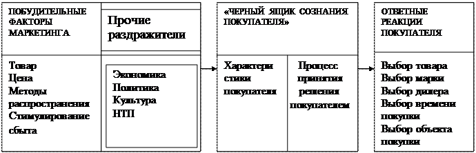 Побудительные факторы маркетинга включают в себя четыре элемента: товар, цену, методы распространения и стимулирование сбыта. Прочие раздражители складываются из основных сил и событий из окружения покупателя; экономической, научно-технической, политической и культурной среды. Пройдя через «Черный ящик» сознания покупателя, все эти раздражители вызывают ряд поддающихся наблюдению покупательских реакций, представленных в правом прямоугольнике: выбор товара, выбор марки, выбор дилера, выбор времени покупки, выбор объекта покупки.