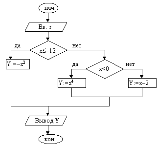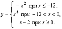 | 1. Ввести x. 2. Если x£–12, то y:=–x2 3. Если x<0, то y:=x4 4. y:= x–2 5. Вывести y 6. Конец |