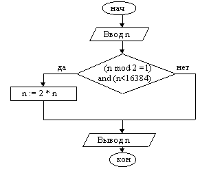 | 1. Ввести число n 2. Если число n нечетное и меньше 16384, то n:= n * 2 3. Вывод n 4. Конец |