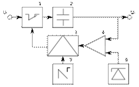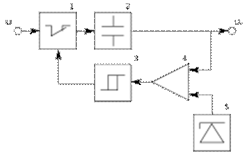 Несколько иначе устроен ключевой стабилизатор напряжения (называемый также релейным или стабилизатором с двухпозиционным регулированием [2]). В нём также входное напряжение поступает через ключевой элемент (1) на накопитель (2), а выходное сравнивается с опорным в ОУ (4). Однако разность между ними подаётся на триггер Шмитта (3). Как только выходное напряжение превышает опорное на определённую величину U1, триггер Шмитта открывается и закрывает ключ (1). Накопитель разряжается, пока напряжение на нём не упадёт ниже некоторой величины U2, после чего ключ снова открывается и процесс повторяется.