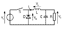 Кроме ключа S и дросселя L содержит диод D и конденсатор C. Когда ключ S замыкается, ток от источника течёт через дроссель L и нагрузку. ЭДС самоиндукции дросселя приложена обратно напряжению источника тока. В результате напряжение на нагрузке равно разности напряжения источника питания и ЭДС самоиндукции дросселя, ток через дроссель растёт, как и напряжение на конденсаторе C и нагрузке. При разомкнутом ключе S ток продолжает протекать через дроссель в том же направлении через диод D и нагрузку, а также конденсатор C. ЭДС самоиндукции приложена к нагрузке R через диод D, ток через дроссель постепенно уменьшается, как и напряжение на конденсаторе C и на нагрузке[3].