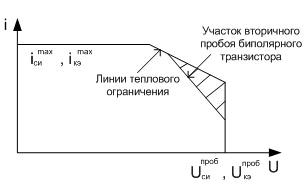 Последнее преимущество полевого транзистора связано с его тепловыми свойствами — полное отсутствие вторичного пробоя. Это преимущество позволяет эффективнее использовать полевой транзистор по передаваемой мощности. На рисунке обозначены области безопасной работы мощного биполярного и полевого транзисторов, максимальные токи и напряжения которых выбраны примерно одинаковыми.