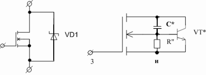 . Емкость этого конденсатора невелика. Для включения паразитного транзистора может оказаться достаточным быстрый спад или рост напряжения “сток-исток”, например, при коммутации токов большой величины. В тот момент, когда мы считаем транзистор закрытым, он вновь открывается, что легко может вывести схему из строя.