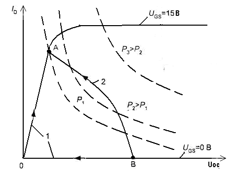 Потери на переключение транзистора вызваны тем, что переход от включенного состояния к выключенному и обратно происходит не мгновенно, а в течение определенного, пусть даже малого, времени. Во время переключения рабочая точка транзистора находится в активной области на выходных характеристиках. В идеале переключение транзистора следовало бы проводить по траектории 1. Например, для перевода транзистора из выключенного состояния (точка В) во включенное (точка А), следует сначала при нулевом токе уменьшить напряжение сток-исток U