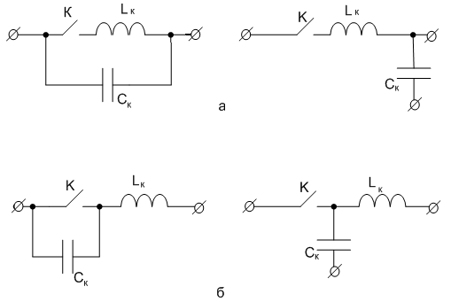 Схемы ключей (а)обеспечивают включение и выключение ключей при нулевом токе, а схемы (б) - включение и выключение ключей при нулевом напряжении. Двухполюсные схемы резонансных ключейна рисунке слева прямо заменяют ключи в широтно-импульсных преобразователях постоянного напряжения. Трёхполюсные схемы резонансных ключей на рисунке справа заменяют ключи в ШИМ так, что их третий полюс (с емкостью) попадает на общую шину питания или выхода.