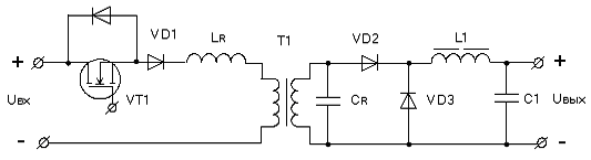Этот узел является резонансным вариантом прямоходового преобразователя. Здесь простой ключ заменен резонансным ключом, состоящим из компонентов VT1, LR, CR. В принципе, в качестве резонансной индуктивности может использоваться индуктивность рассеяния трансформатора. Пусть первоначально транзистор VT1 закрыт. Выходной ток течет за счет энергии, запасенной в дросселе выходного фильтра L1 через диод VD3. В некоторый момент времени, определяемый узлом управления, ключ VT1 открывается. Колебательный контур, образованный катушкой LR и конденсатором CR, начинает получать энергию. Заряд конденсатора CR и последующий его разряд будут происходить по закону, близкому к синусоидальному, с частотой, равной резонансной частоте контура LRCR. Одновременно ток в катушке LR также будет изменяться по синусоидальному закону — вначале увеличиваться, затем уменьшаться. Когда этот ток уменьшится до нуля, нужно закрыть ключ. При этом диод VD1 предотвращает обратный ток через паразитный диод МОП-транзистора, который мог бы быть вызван продолжающимся резонансным процессом.