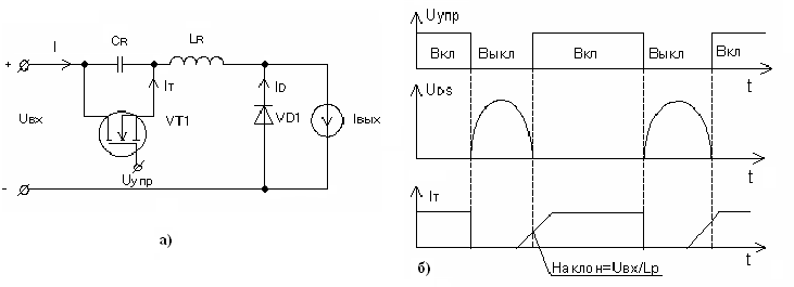 Как видно, это простой однотактный понижающий преобразователь. В конце открытого состояния ключа (МОП-транзистор VT1) конденсатор резонансного контура CR разряжен, а ток катушки резонансного контура LR равен выходному току (полагаем выходной ток постоянным). При закрывании ключа открывается диод VD1 и начинается колебательный переходный процесс заряда конденсатора CR током катушки LR, причем, если пренебречь потерями, то можно считать, что этому процессу отвечает дифференциальное уравнение