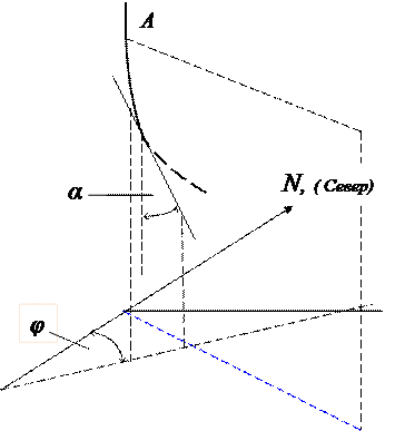 Пространственное положение любой скважины можетбыть определено тремя ее параметрами: глубиной S, зенитным α и азимутальным φ углами на этой глубине.Зенитнымуглом в точке В (рисунок 1.2) траектории скважины называется угол между касательной в этой точке и вертикалью. Угол между проекцией касательной к оси ствола скважины в данной точке на горизонтальную плоскость и направлением на Север называется азимутом (азимутальным углом) скважины в данной точке.