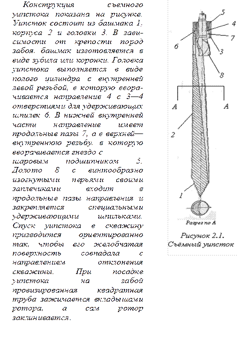 Наклонно направленное бурение на нефть впервые было осуществлено во второй половине 1934 года на грозненских промыслах. Здесь разведка и освоение поднадвиговых пластов вертикальными скважинами натолкнулись на чрезвычайные трудности - сложность попадания в заранее намеченный пласт, сильное естественное искривление вертикальных скважин и др. Первый опыт применения ориентированного искривления при помощи съемного уипстока (отклоняющего клина - рисунок 2.1) с универсальным шарниром был произведен в скважине № 2/50. Но этот опыт не увенчался успехом: ствол скважины не удалось искривить в определенном направлении из-за аварий с уипстоком и отсутствия соответствующего опыта у работников бурения. В мае 1935 года была заложена скважина