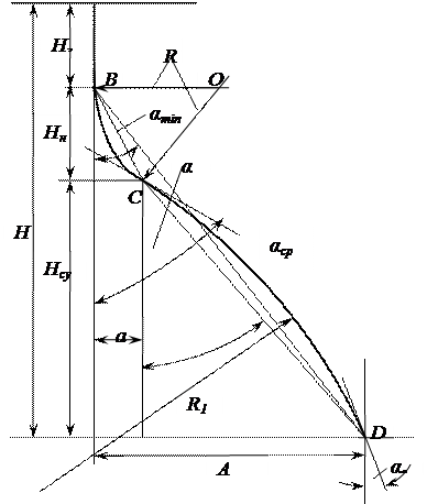 Расчётная схема представлена на рисунке 4.4. Исходные данные для расчёта: Н - глубина скважины по вертикали до кровли продуктивного пласта; Нну - глубина зарезки наклонного ствола; А - проектное смещение; R - радиус искривления на интервале набора зенитного угла, αвп зенитный угол входа в продуктивный пласт.
