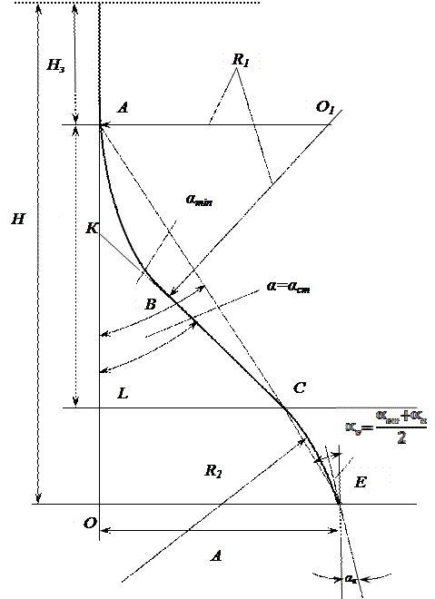 Hз –глубина зарезки наклонного ствола из вертикали; Н – глубина до кровлипродуктивного пласта, на которой зенитный угол должен будет достигнут заданного αк; дуга АВ - длина интервала набора зенитного угла радиусом искривления R1 (по стволу); Отрезок прямой АВ – хорда, стягивающая дугу АВ;