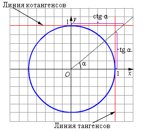 Легко заметить, что если построить луч с началом в начале координат, составляющий угол α с положительным направлением оси абсцисс, то длина отрезка от точки (1; 0) до точки пересечения этого луча с линией тангенсов в точности равна тангенсу угла, который составляет этот луч с осью абсцисс. Аналогичное наблюдение имеет место и для котангенса.