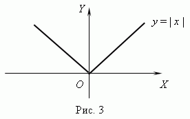 | П р и м е р. | Функция y = | x | (рис.3) всюду непрерывна, но она не имеет производной при x = 0, так как в этой точке не существует касательной к графику этой функции. (Подумайте, почему?) |