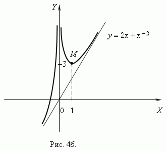 ) и убывает на интервале (0, 1). Точка x = 0 не входит в область определения функции, но по мере приближения x к 0 слагаемое x - 2 неограниченно возрастает, поэтому функция также неограниченно возрастает. В точке x = 1 значение функции равно 3. В соответствии с этим анализом мы можем построить график функции (рис.4 б).