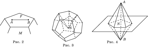 Доказательство. Пусть F - какая-нибудь грань многогранника M, и A, B – точки, принадлежащие грани F (рис. 2). Из условия выпуклости многогранника M, следует, что отрезок AB целиком содержится в многограннике M. Поскольку этот отрезок лежит в плоскости многоугольника F, он будет целиком содержаться и в этом многоугольнике, т.е. F - выпуклый многоугольник.
