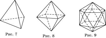 | B=4, Р=6, Г=4 тетраэдр | В=6, Р=12, Г=8 октаэдр | В=12, Р=30, Г=20 икосаэдр | |