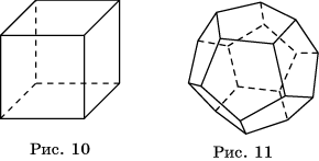 Аналогично, поскольку в вершинах выпуклого многогранника может сходиться только три квадрата, то, кроме куба (рис. 10), других правильных многогранников, у которых гранями являются квадраты не существует. Куб имеет шесть граней и поэтому называется также гексаэдром.