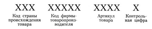 Товарные штрих-коды разработаны Европейской ассоциацией пользователей систем штрихового кодирования товаров (EAN), членом которой в настоящее время является и Российская Федерация. Внутри стран присвоение кодов осуществляется торгово-промышленными палатами. Наибольшее распространение получила версия EAN-13, в которой каждой группе цифр соответствует свое обозначение (рис. 12).