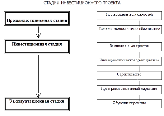 - предынвестиционная стадия, в процессе которой осуществляется исследование возможностей по реализации инвестиционного проекта, разрабатывается технико-экономическое обоснование проекта;
