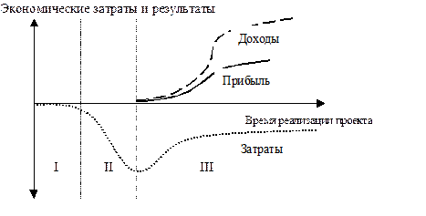 (I – предынвестиционная стадия, II – инвестиционная стадия, III – эксплуатационная стадия проекта)