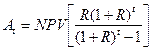 В этом виде значение At определяет эквивалент годового эффекта, получаемого в результате реализации проекта. Положительное значение этого показателя свидетельствует об экономической привлекательности проекта. При сравнении альтернативных проектов более привлекательным является проект с наибольшим годовым эффектом.