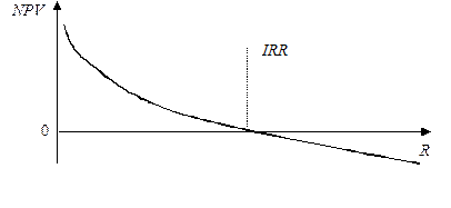 Для определения показателя внутренней рентабельности проекта может использоваться графический метод, основанный на построении графика значений NPV при различных значениях ставки дисконта. При этом значение R, при котором график пересекает ось абсцисс, как это показано нарис. 7.8, и определяет искомое значение внутренней рентабельности проекта.