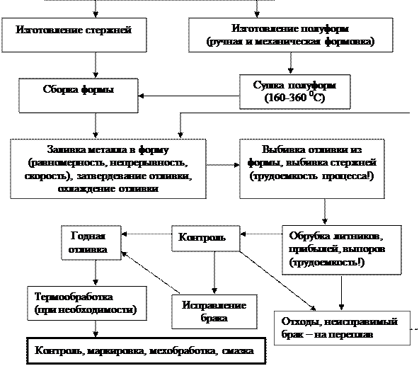 Формы изготавливаются в специальных ящиках – опоках или - для крупногабаритных изделий – в грунте. Сырьем для изготовления формы служит кварцевый песок, глина с добавками шамота и древесных стружек или торфа (для большей газопроницаемости). Для изготовления стержней, к материалу которых предъявляются большие требования по стойкости, в качестве связующего используют не глину, а синтетические смолы, жидкое стекло. Как в стержневую, так и в формовочную смесь добавляют противопригарные материалы, снижающие адгезию. Для уменьшения трудоемкости применяют машинную формовку (при серийном производстве).