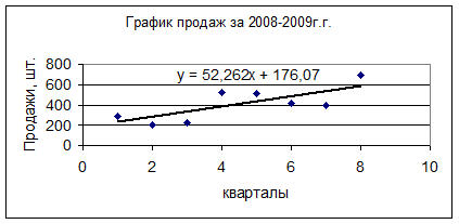 1-й квартал 2010 года: Y9 = (176,07+52,26*9)* 1,25 = 808 шт.;
