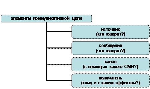Первые систематические исследования процесса массовой коммуникации были предприняты в работах американского социолога Гарольда Лассвелла. Предложенная им в первой половине XX века модель процесса массовой коммуникации в виде коммуникативной цепи и сегодня может быть использована для анализа указанного процесса. В этой цепи он выделяет четыре основных элемента: источник (кто говорит?), сообщение (что говорит?), канал (как, с помощью какого технического средства?) и получатель (кому говорит и с каким эффектом?).