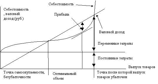 Рассмотрев график изменения себестоимости в зависимости от производственной и маркетинговой ситуаций, предприниматель должен проанализировать график прибыльности (безубыточности) (рис.) и определить критический объем производства при различных уровнях цен.