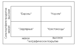 Наилучшая позиция, конечно, у “королей”, что дает им возможность расширять дело. Наихудшая позиция у “заурядных”, которые нуждаются в стратегии маркетинговых ниш. “Бароны” имеют возможность экспансии, но концентрируются в ограниченном числе стран. “Крестоносцы” хотя и работают во многих странах, но их позиция уязвима из-за слабости продуктового портфеля.