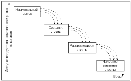 Обычный подход к жизненному циклу продукта при интернациональном маркетинге иллюстрируется на “модели перетекания” (рис.).