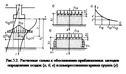 Осадка грунта происходит только в пределах глубины сжимаемой толщи Нс. Осадка основания происходит только за счёт сжатия столба грунта, непосредственно находящегося под подошвой фундамента (рис. 5.2, а). Сжатие каждого элементарного слоя мощностью Δ z вызывается равномерно распределенной на его поверхности нагрузкой равной максимальному значению σ zp, действующему по оси z.